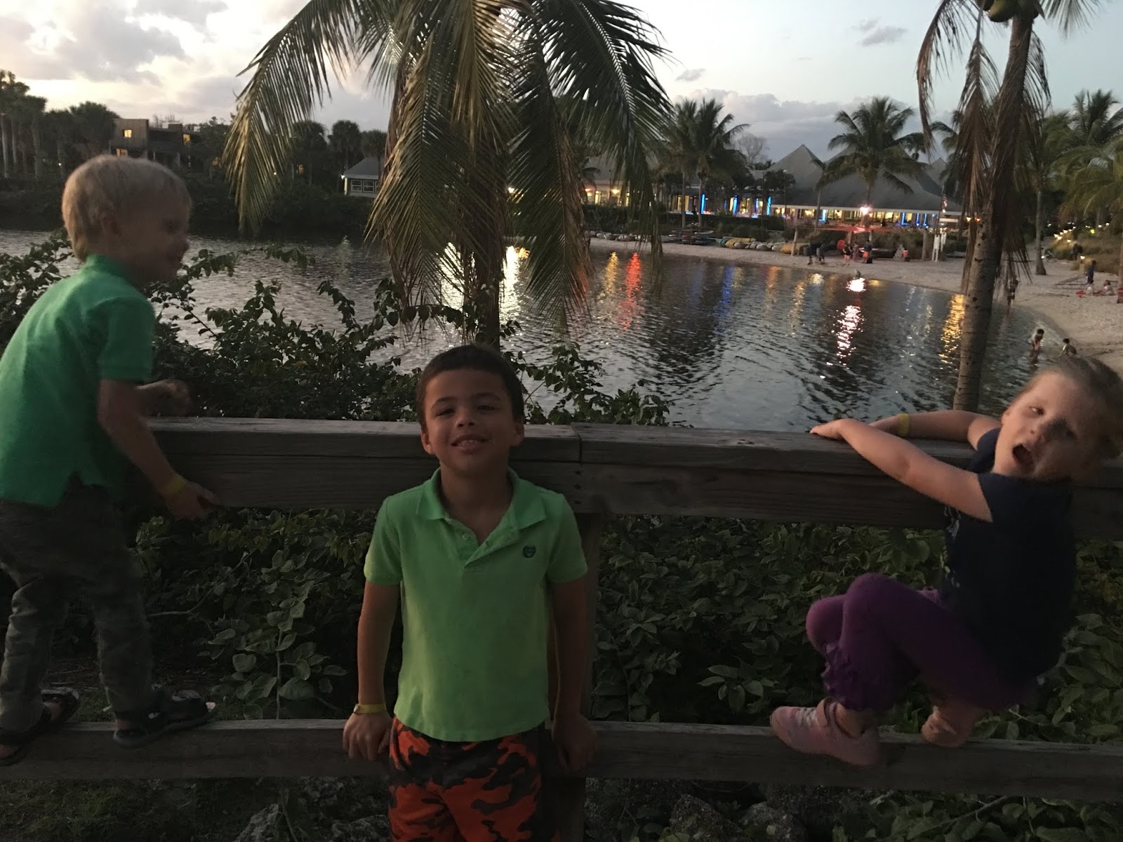 We just returned from what was probably our best family vacation yet to Club Med Sandpiper Bay in Port St. Lucie, Florida. The drive there and back was not too terrible (Atlanta traffic notwithstanding), the weather was perfect (except for the rainy and breezy last day), and the kids had a blast. Of course, it didn't hurt that they also participated in the Mini-Club a few hours each day. It was a win-win: they were able to play with other kids and do fun stuff like the trapeze, sports, splash pad, arts and crafts and such, while Mom and Dad were able to relax by the peaceful adult only pool for a few hours. The kids even participated in a fun Super Hero Show, which was the main entertainment one evening. Caleb bemused everyone as Batman, Wren was wonderful as Wonder Woman, and Judson was superb as Super Man. One day we ventured off the resort and went to a local children's museum and Jensen Beach, where the waves were huge! Back at the resort, they truly enjoyed all the trips to the buffet (where they all ate their weight in chicken nuggets and fries during the course of our stay and enormously enjoyed drinking from fancy glasses, of which we (Judson) only broke two), swimming, and playing at the beach. We also discovered (due to out lack of having brought any bedtime books) that they are all enthralled by my made up stories at bedtime. Though I do not consider myself to be any master storyteller by any stretch of the imagination, it was sweet to see their anticipation of the night's story and their rapt attention and wide eyes as I unfolded the plot. We'll have to see if we can work that into our bedtime routine at home. Or maybe it will just be a special vacation tradition...Either way, we made lots of memories, and it was a nice way to break up winter. We're all looking forward to our next trip to Club Med!