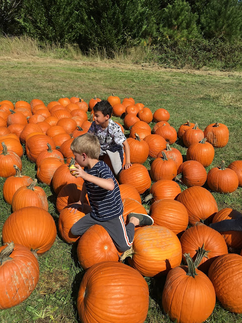 Last weekend, I took the kids to Berry Patch Farms in Woodstock to pick out some pumpkins. Little did I know, that pumpkin picking was just one of many activities for them to enjoy. We played on the playground, pretended to drive a tractor, were to afraid to ride on an actual tractor (Judson), ran and played in an open field under a crisp blue sky, resisted the urge to buy any sweet-smelling cotton candy, picked out the perfect pumpkins, carried said pumpkins (all 50 pounds of them) back to the line to pay and then back to the van (a real-life Farmer's Carry - perhaps pumpkins are the new must-have workout equipment?), and rode on the pony and cart ride. What a fun trip!
